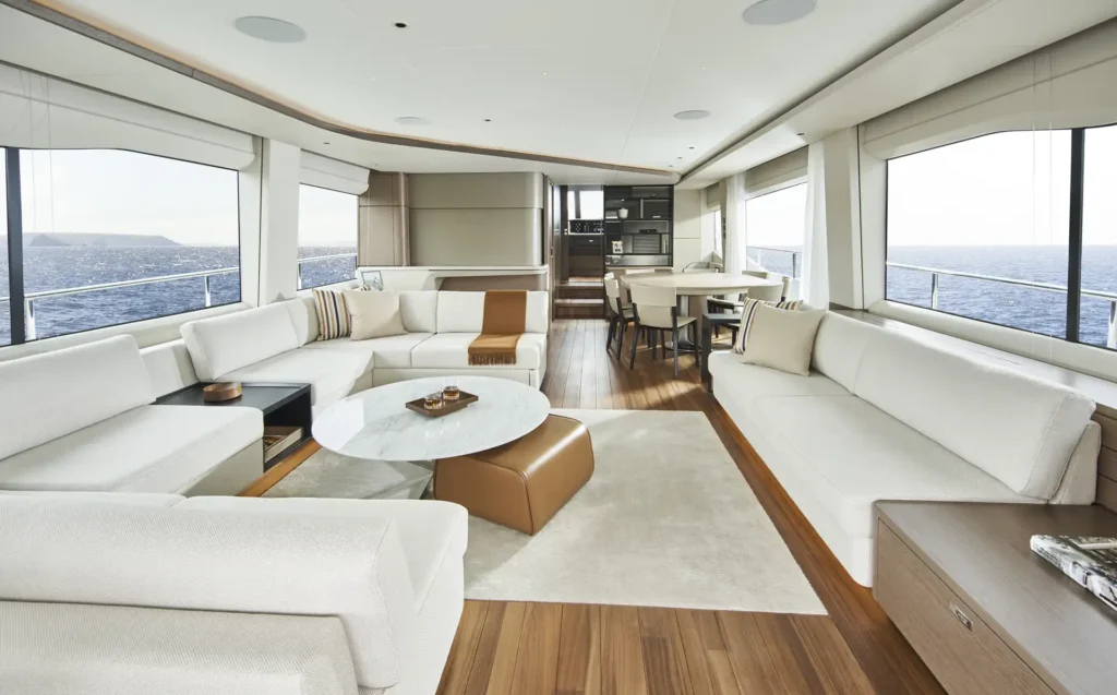 Das offen gestaltete Hauptdeck bietet flexible Raumlösungen, ideal zur Unterhaltung. Drei separate Sitzbereiche gewährleisten Privatsphäre, während sich die Crew diskret bewegt. Unter Deck finden bis zu acht Gäste in vier stilvollen Kabinen mit eigenem Bad Platz. Die vollbreite Eignerkabine ist ein Highlight des Designs, ergänzt durch eine VIP-Kabine mit begehbarem Kleiderschrank, eine Doppelkabine und eine wandlungsfähige Zweibettkabine. Die Y85 trägt unverkennbar die Handschrift von Princess Yachts.